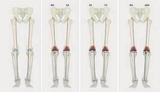 Рисунок 4. Схемы различных методов выравнивания, описанных в тексте, на примере коленного сустава с варусной деформацией 6". (МА: механическое выравнивание, АА: анатомическое выравнивание, КА: кинематическое выравнивание, FA: функциональное выравнивание, гКА: ограниченное кинематическое выравнивание, аМА: скорректированное механическое выравнивание). Иллюстрация Р. Химмельхана, авторские права принадлежат П. Веберу и Х. Голлвитцеру [34]