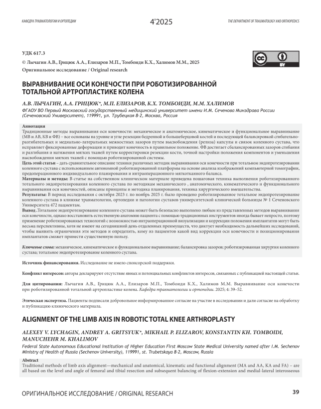 Традиционные методы выравнивания оси конечности: механическое и анатомическое, кинематическое и функциональное выравнивание (МВ и АВ, КВ и ФВ) – все основаны на уровне и угле резекции бедренной и большеберцовой костей и последующей балансировкой сгибательно- разгибательных и медиально-латеральных межкостных зазоров путем высвобождения (релиза) капсулы и связок коленного сустава, что исправляет фиксированные деформации и приводит конечность в правильное положение. ФВ достигает сбалансированных зазоров сгибания и разгибания и натяжения мягких тканей путем корректировки резекции кости, точной настройки положения компонентов и уменьшения высвобождения мягких тканей с помощью роботизированной системы. Цель этой статьи – дать сравнительное описание техники различных методик выравнивания оси конечности при тотальном эндопротезировании коленного сустава с использованием автономной роботизированной платформы на основе анализа изображений компьютерной томографии, предоперационного индивидуального планирования и интраоперационного мягкотканного баланса. Материалы и методы: В статье на собственном клиническом материале приведена пошаговая техника выполнения роботизированного тотального эндопротезирования коленного сустава по методикам механического , анатомического, кинематического и функционального выравнивания оси конечностей, описаны принципы и методика планирования, техника хирургического вмешательства. Результаты: В период исследования с октября 2023 г. по ноябрь 2025 г. было проведено роботизированное тотальное эндопротезирование коленного сустава в клинике травматологии, ортопедии и патологии суставов университетской клинической больницы № 1 Сеченовского Университета 472 пациентам. Вывод .Тотальное эндопротезирование коленного сустава может быть безопасно выполнено любым из представленных методов выравнивания оси конечности, однако восстановить естественную анатомию пациента с помощью традиционных инструментов иногда бывает непросто, поэтому применение роботизированных технологий с возможностью интраоперационной визуализации и коррекции положения имплантатов могут быть весьма перспективны, хотя не имеют на сегодняшний день отдаленных преимуществ, что диктует необходимость дальнейших исследований, чтобы выявить ограничения эти методов и определить, кому из пациентов какой вид коррекции оси конечности и позиционирования имплантатов сможет принести существенную пользу.