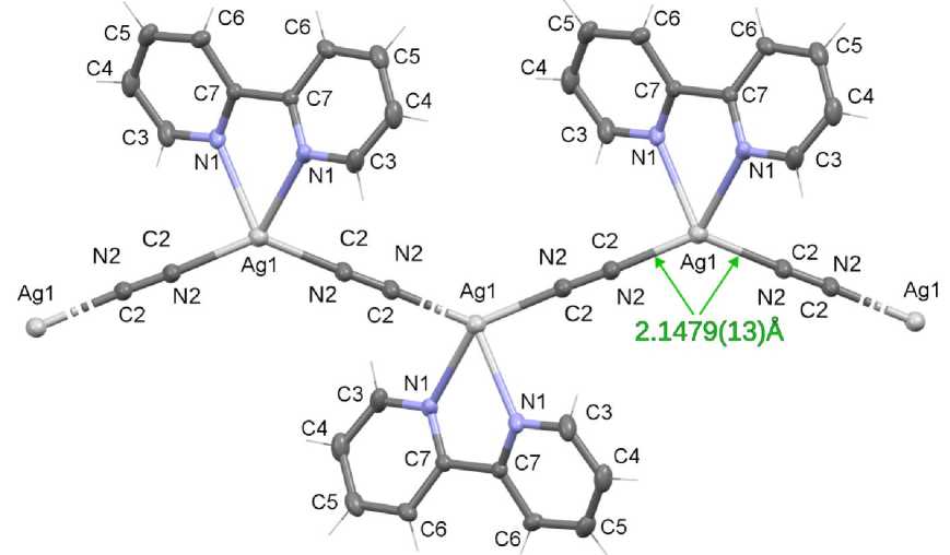 Взаимодействием 2,2’-бипиридила с дицианоаргентатом калия в водно-спиртовом растворе получено катена-[(2-циано)-(2,2'-бипиридил)-серебро(I)], строение которого доказано рентгеноструктурным анализом (bpy)Ag(CN)2 (1) [C10,73H8AgN3,27, M = 290,61; моноклинная сингония, пр. гр. С2/с; параметры ячейки: a = 12,2677(2) Å, b = 8,60700(10) Å, c = 10,1225(2) Å; β = 106,871(2), V = 1022,81(3) Å3, Z = 4; выч = 1,887 г/см3; = 1,937 мм–1; F(000) = 569; обл. сбора по q: 3,30430,500; всего отражений 12678; независимых отражений 1564 (Rint = 0,0249); GOOF = 1,094; R1-фактор 0,0185]. Аддукт 1 представляет собой одноцепочечный полимер с четырёхкоординированными атомами серебра, линейно соединёнными разупорядоченными цианидными мостиками.
