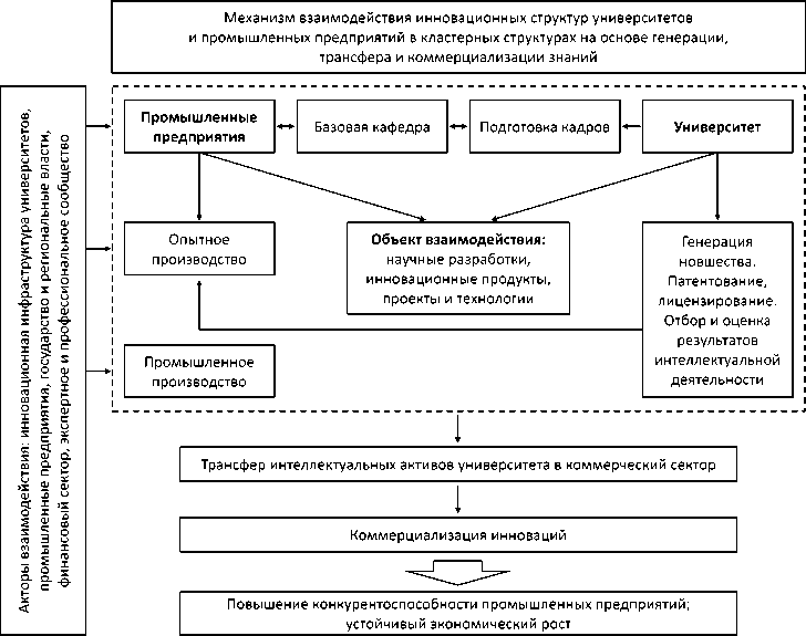 Рис. Механизм взаимодействия инновационных структур университетов и промышленных предприятий внутри кластера как единой экосистемы /