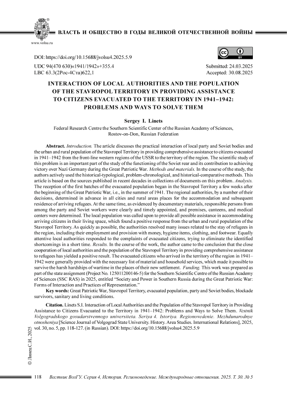 Citation. Linets S.I. Interaction of Local Authorities and the Population of the Stavropol Territory in Providing Assistance to Citizens Evacuated to the Territory in 1941–1942: Problems and Ways to Solve Them. Vestnik Volgogradskogo gosudarstvennogo universiteta. Seriya 4. Istoriya. Regionovedenie. Mezhdunarodnye otnosheniya [Science Journal of Volgograd State University. History. Area Studies. International Relations], 2025, vol. 30, no. 5, pp. 118-127. (in Russian). DOI:
