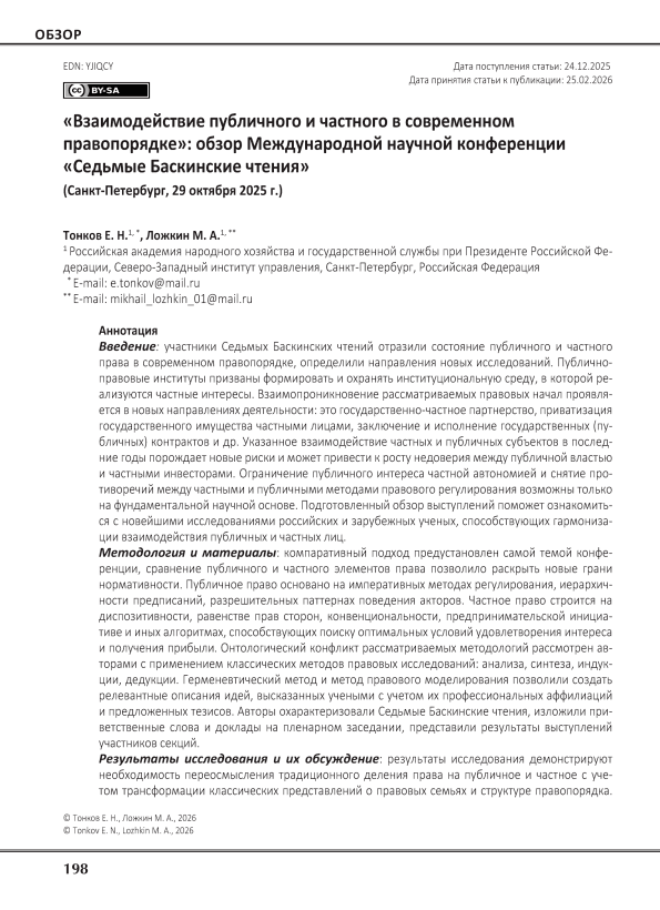 Introduction: Participants in the Seventh Baskin Readings reflected on the state of public and private law in the modern legal order and identified areas for new research. Public law institutions are called upon to shape and protect the institutional environment in which private interests are realized. The interpenetration of these legal principles is manifested in new areas: public-private partnerships, the privatization of state property by private entities, the conclusion and execution of state (public) contracts, etc. This interaction between private and public entities has in recent years generated new risks and may lead to increased mistrust between public authorities and private investors. Limiting public interest to private autonomy and resolving contradictions between private and public methods of legal regulation are possible only on a fundamental scientific basis. This overview of the presentations will help you become familiar with the latest research by Russian and international scholars, promoting the harmonization of interactions between public and private entities. Methodology and materials: The comparative approach is predetermined by the conference theme itself; comparing public and private law allowed for the discovery of new facets of normativity. Public law is based on imperative regulatory methods, a hierarchical structure of regulations, and permissive patterns of behavior. Private law is built on discretion, equality of rights between parties, conventionality, entrepreneurial initiative, and other algorithms that facilitate the search for optimal conditions for satisfying interests and generating profit. The authors examined the ontological conflict between the methodologies under consideration using classical methods of legal research: analysis, synthesis, induction, and deduction. The hermeneutic method and legal modeling allowed for the creation of relevant descriptions of the ideas expressed by scholars, taking into account their professional affiliations and proposed theses. The authors described the Seventh Baskin Readings, presented welcoming remarks and papers at the plenary session, and presented the results of the section participants’ presentations. Research Results and Discussion: The results demonstrate the need to rethink the traditional division of law into public and private, taking into account the transformation of classical notions of legal families and the structure of the legal order. At the conference, which brought together representatives from 10 countries and 30 leading universities, over 35 researchers presented, reflecting on key trends in the development of regulatory systems. The active participation of representatives from all branches of government, including judges from national and international jurisdictions, demonstrates the importance of exchanging scholarly opinions between private and public figures. The study confirms the importance of an cross-sectoral approach to studying the interaction of public and private law and the relevance of further interdisciplinary communication. Conclusions: Conference participants noted the need to rethink the traditional division of law into public and private in the face of modern challenges, including digitalization and globalization. An analysis of the presentations demonstrates the existence of a gap between private and public law in the post-Soviet academic paradigm. A call was made to rethink the dogmatic notions inherited from the Soviet legal structure and reproduced in the educational process. There is a clear need to develop an integrative approach to the sectoral division of law and a transition from the tripartite legal structure of “sector – institution – norm” to a more complex construct that corresponds to the real legal order.