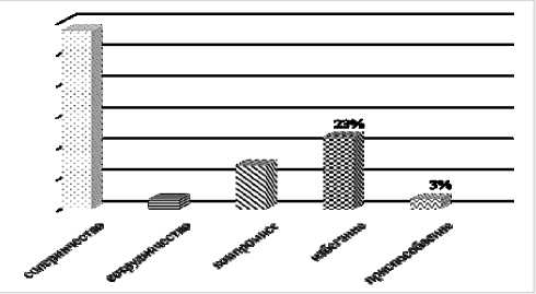 Наименее распространенными оказались стратегии «сотрудничество» и «приспособление», каждая из которых была выявлена у 3 % опрошенных (по 1 человеку).
