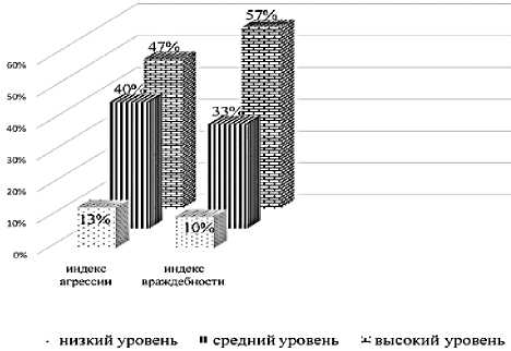 Рисунок 2. Выраженность уровня враждебности и агрессии у подростков по методике А. Басса и А. Дарки, %
