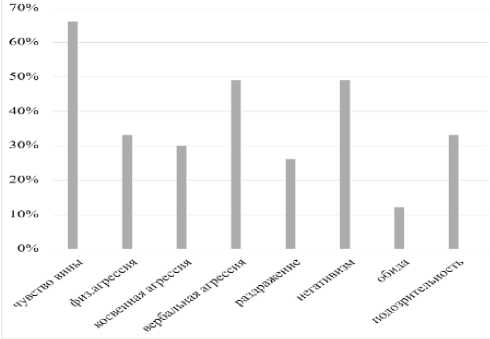 Кроме того, анализируя данные этой методики, мы можем констатировать, что наиболее проявляемой формой агрессии у подростков является чувство вины — у 66 %, физическая агрессия характерна для 33 % подростков, косвенная — для 30 %, а вербальная — для 49 %, раздражение присуще 26 %, негативизм — 49 %; обида может проявляться у 12 % подростков и у 33 % — подозрительность (см. рисунок 3).