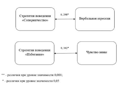 ностью использования конкурентной модели урегулирования конфликтов и частотой проявления словесной агрессии, включающей различные формы психологического давления и деструктивной коммуникации. Также статистический анализ выявил достоверную положительную корреляцию (r = 0,342, p ≤ 0,05) между тенденцией к избеганию конфликтных ситуаций и развитием чувства вины у исследуемой группы респондентов (рисунок 4).