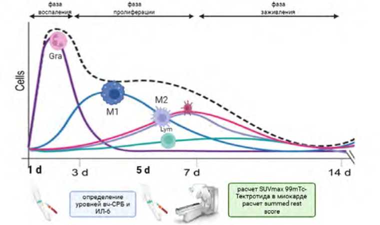В постинфарктном воспалительном каскаде выделяют 3 фазы: воспалительную, фазу пролиферации и фазу заживления. Принято считать, что критическим этапом реконструкции тканей после ИМ является фаза пролиферации, которая существенно влияет на степень последующего ремоделирования [8]. Чрезмерность и длительность воспалительных и фиброгенных реакций являются причинами неблагоприятного ремоделирования с исходом в сердечную недостаточность. Факторы, влияющие на данную дисрегуляцию, до сих пор являются предметом дискуссии. Однако в мировой литературе закрепилось мнение о том, что макрофаги играют решающую роль в регуляции иммунной системы и оказывают существенное влияние на процесс воспалительной репарации после ОИМ, тем самым определяя степень повреждения миокарда и последующее патологическое ремоделирование [13].