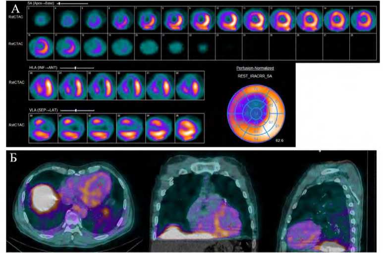 Рис. 2. А – перфузионная сцинтиграфия миокарда в покое с 99mTc-Технетрилом, выполненная на 8-е сутки после острого инфаркта миокарда (срезы по короткой оси, срезы по вертикальной оси, срезы по горизонтальной оси, полярная карта). Визуализируется зона больших размеров гипоперфузии в области верхушки, передней стенки, передне-перегородочной области. Б – ОФЭКТ / КТ с 99mTc-Тектротидом, выполненная через 3 часа после введения радиофармпрепарата на 7-е сутки после острого инфаркта миокарда (аксиальный, фронтальный и сагиттальный срезы). На совмещенных изображениях визуализируется диффузная аккумуляция радиофармпрепарата в проекции верхушки, передней стенки, перегородки