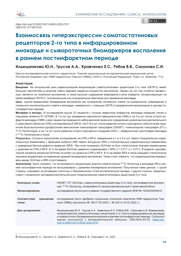 Взаимосвязь гиперэкспрессии соматостатиновых рецепторов 2-го типа в инфарцированном миокарде и сывороточных биомаркеров воспаления в раннем постинфарктном периоде