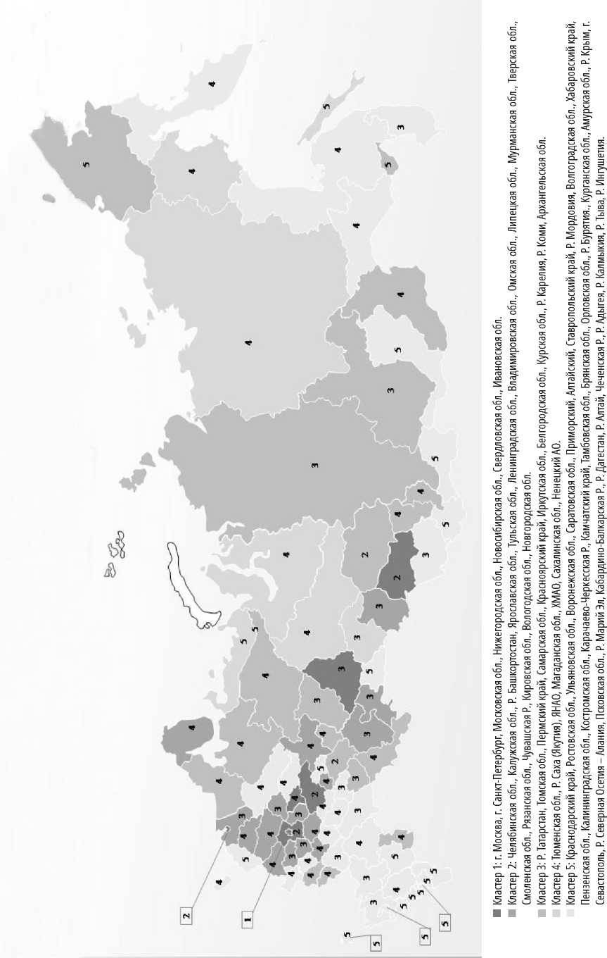 Коротко охарактеризуем образовавшиеся кластеры. В первом случае (см. табл. 1) совокупность была разбита на 5 кластеров, упорядоченных в табл. 2 по убыванию агрегированного индекса. Кластер 1 включает всего один элемент – г. Москву, во втором кластере – 6 субъектов18, в третьем – 22 региона19, четвертый кластер составили 35 субъек-тов20. Наконец, пятый кластер объединяет 22 субъекта с самым низким уровнем НТР21.