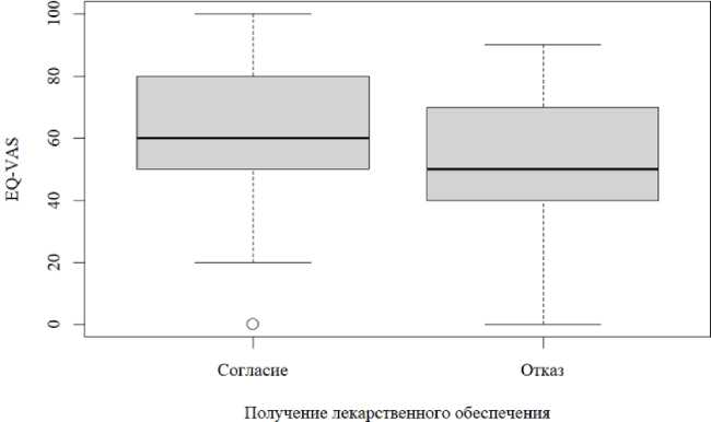 Рис. 2. Ассоциация между субъективной оценкой пациентом состояния своего здоровья по визуальной аналоговой шкале (EQ-VAS) и согласием на получение помощи в виде медикаментов