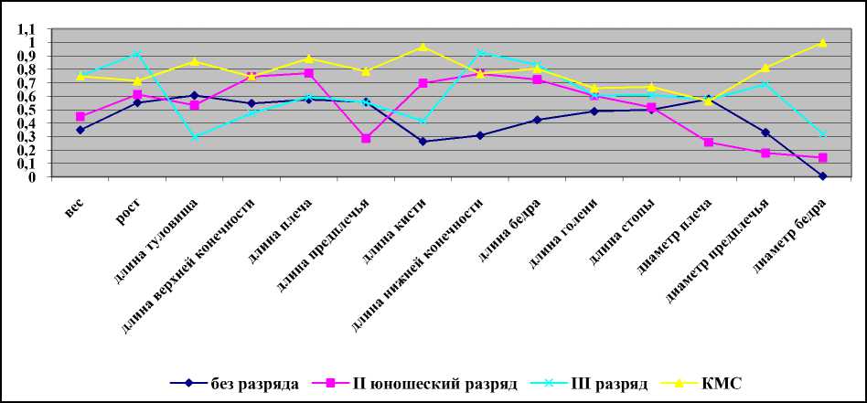 У волейболистов 17–21 года, имеющих второй юношеский разряд, высота прыжка на блоке имела тесную зависимость с длиной верхней конечности, плеча, нижней конечности, бедра, среднюю – с показателями роста, длины туловища, кисти, стопы, голени. Особенностью данной группы является появление более тесной зависимости между вышеназванными показателями и повышение роли длины плеча (r = 0,772), нижних конечностей (r = 0,767), верхних конечностей (r = 0,746), бедра (r = 0,724), чего не отмечалось в такой же возрастной группе, но низшей квалификации (см. рисунок).