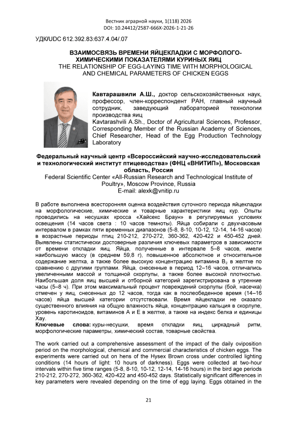 В работе выполнена всесторонняя оценка воздействия суточного периода яйцекладки на морфологические, химические и товарные характеристики яиц кур. Опыты проводились на несушках кросса «Хайсекс Браун» в регулируемых условиях освещения (14 часов света : 10 часов темноты). Яйца собирали с двухчасовым интервалом в рамках пяти временных диапазонов (5-8, 8-10, 10-12, 12-14, 14-16 часов) в возрастные периоды птиц 210-212, 270-272, 360-362, 420-422 и 450-452 дней. Выявлены статистически достоверные различия ключевых параметров в зависимости от времени откладки яиц. Яйца, полученные в интервале 5–8 часов, имели наибольшую массу (в среднем 59,8 г), повышенное абсолютное и относительное содержание желтка, а также более высокую концентрацию витамина В₂ в желтке по сравнению с другими группами. Яйца, снесенные в период 12–16 часов, отличались увеличенными массой и толщиной скорлупы, а также более высокой плотностью. Наибольшая доля яиц высшей и отборной категорий зарегистрирована в утренние часы (5–8 ч). При этом максимальный процент повреждений скорлупы (бой, насечка) отмечен у яиц, снесенных до 12 часов, тогда как в послеобеденное время (14–16 часов) яйца высшей категории отсутствовали. Время яйцекладки не оказало существенного влияния на общую влажность яйца, концентрацию кальция в скорлупе, уровень каротиноидов, витаминов А и Е в желтке, а также на индекс белка и единицы Хау.