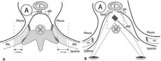 Продленный до вырезки грудины передний шейный доступ позволяет в ряде случаев выполнить подход к телам Th1-Th2 позвонков. Эта возможность определяется индивидуальными особенностями строения пациента. Бесспорными преимуществами метода являются минимальная травматичность и возможность проведения передней фиксации. Его реализации препятствует коротка шея, высокое стояние плечевых суставов и кифоз шейно-грудного перехода. В этой ситуации осуществить подход к верхним грудным позвонкам возможно с помощью резекции грудного конца ключицы и рукоятки грудины. При этом неудобный “угол атаки” из-за кифоза верхнегрудного отдела позвоночника и нависающей грудины затрудняет визуальный контроль во время проведения операции и препятствует установке вентральных металлоконструкций. Кроме того, эти оперативные приёмы не могут обеспечить доступ к передним отдела позвоночника ниже Th3 позвонка [18–20].