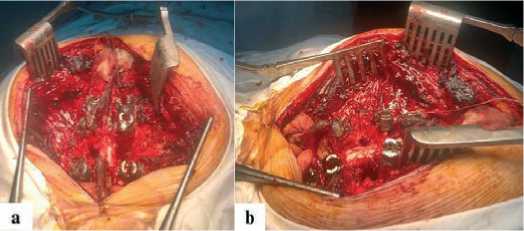 a, b – циркулярная декомпре ссия спинного мозга и ложе резецированного позвонка; вид сверху (a) и сбоку (b)
