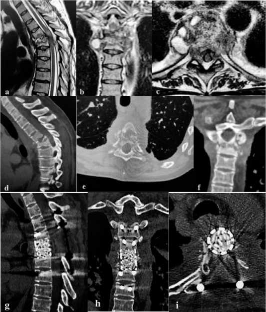 Рисунок 3 . Результаты обследования до и после хирургического лечения. а, b, c – магниторезонансные томограммы (сагиттальная проекция (а), фронтальная (b) и аксиальная (с) проекции): определяется гнойный спондилит Th5-Th6 позвонков с паравертебральными абсцессами, со сдавлением спинного мозга и присутствием очага миелоишемии; d, e, f - компьютерные томограммы в сагиттальной (d), аксиальной (e) и фронтальной (f) проекции: костная деструкция Th5-Th6 позвонков с наличием секвестров и кифотической деформации на уровне поражения; g, h, I – контрольные компьютерные томограммы в сагиттальной (g), фронтальной (h) и аксиальной (i) проекции: выполнена циркулярная декомпрессия спинного мозга, корпородез Th4-Th7 позвонков, кифотическая деформация устранена