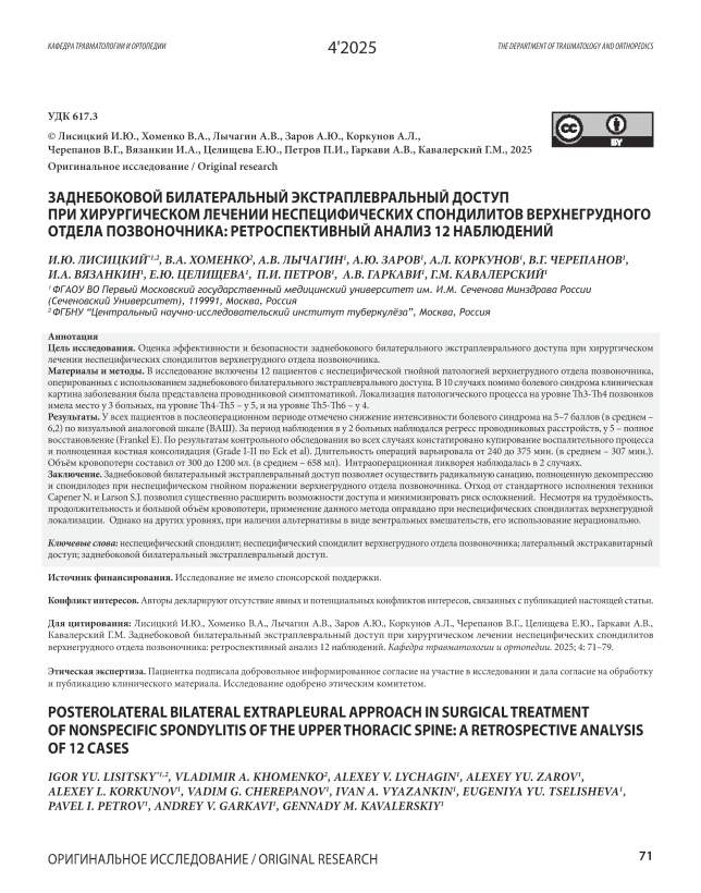 Текст научной статьи Заднебоковой билатеральный экстраплевральный доступ при хирургическом лечении неспецифических спондилитов верхнегрудного отдела позвоночника: ретроспективный анализ 12 наблюдений