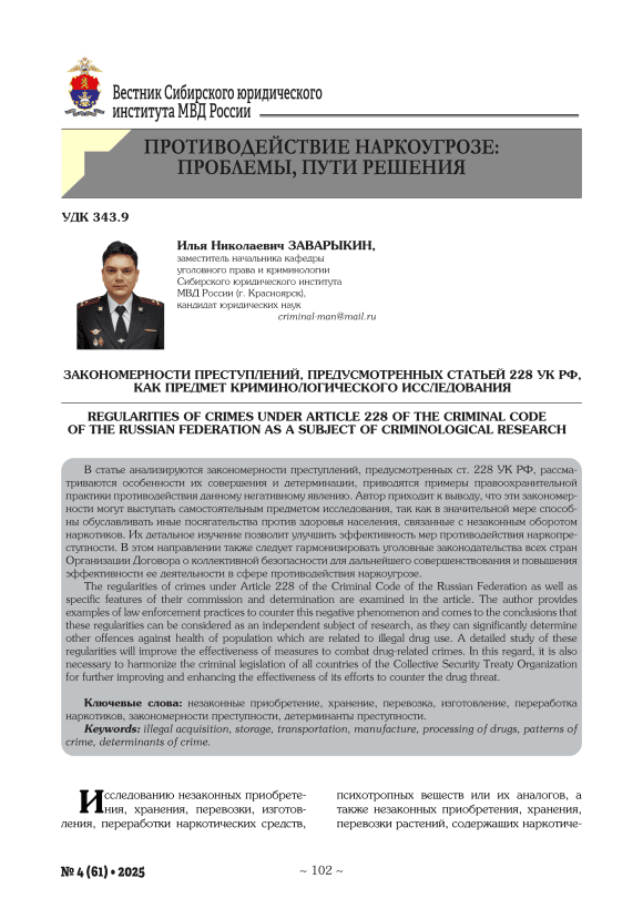 Исследованию незаконных приобретения, хранения, перевозки, изготовления, переработки наркотических средств, психотропных веществ или их аналогов, а также незаконных приобретения, хранения, перевозки растений, содержащих наркотиче- ские средства или психотропные вещества, либо их частей, содержащих наркотические средства или психотропные вещества (далее – наркотиков), посвящено достаточное количество трудов как криминологов, так и других ученых-юристов. Однако в части изучения криминологически значимых закономерностей и предупреждения преступлений, предусмотренных ст. 228 УК РФ, такие исследования носят фрагментарный характер. А закономерности преступности, связанной с рассматриваемыми деяниями, в основном анализируются в совокупности с иными наркопреступлениями как второстепенные, несмотря на их значительную массовость.