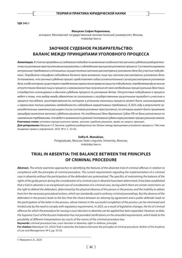The article examines approaches to identifying the features of the absentee trial of criminal offenses in relation to compliance with the principles of criminal procedure. The current requirements regarding the implementation of a criminal case in absentia without the participation of the defendant are systematized. The specifics of maintaining the balance of the rights of the guilty person during the consideration of a criminal case in absentia have been determined. It has been established that a trial in absentia is an exceptional case of consideration of a criminal case, during which there are certain restrictions on the right to defend the defendant, determined by the physical absence of this person in the process and the inability to obtain from him the necessary procedural actions, which are standardly used in ordinary criminal proceedings. But the absence of the defendant in the process leads to the fact that the choice between an attorney by agreement and a public defender leads to the participation of the latter in the process, whose interest in the successful completion of the process can be minimized and limited only by the need to comply with regulatory requirements. In 2025, as a result of legislative changes, the list of criminal offences for which the procedure for issuing a court decision in absentia can be applied has been expanded. However, to date, the Supreme Court of the Russian Federation has not provided clarifications on the amended requirements, which leads to the possibility of different interpretations by courts of the norms of the criminal procedure law.