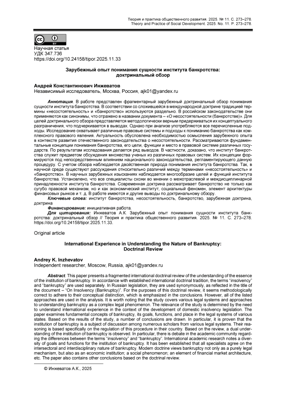 В работе представлен фрагментарный зарубежный доктринальный обзор понимания сущности института банкротства. В соответствии со сложившейся в международной доктрине традицией термины «несостоятельность» и «банкротство» используются раздельно. В российском законодательстве они применяются как синонимы, что отражено в названии документа – «О несостоятельности (банкротстве)». Для целей доктринального обзора представляется методологически верным придерживаться их концептуального разграничения, что подчеркивается в выводах. Однако при анализе употребляются все перечисленные подходы. Исследование охватывает различные правовые системы и подходы к пониманию банкротства как комплексного правового явления. Актуальность обусловлена необходимостью осмысления зарубежного опыта в контексте развития отечественного законодательства о несостоятельности. Рассматриваются фундаментальные концепции понимания банкротства, его цели, функции и место в правовой системе различных государств. По результатам исследования делается ряд выводов. В частности, доказано, что институт банкротства служит предметом обсуждения множества ученых из различных правовых систем. Их концепции формируются под непосредственным влиянием национального законодательства, регламентирующего данную процедуру. С учетом обзора наблюдается двойственная природа понимания института банкротства. Так, в научной среде существуют рассуждения относительно различий между терминами «несостоятельность» и «банкротство». В научных зарубежных изысканиях наблюдается многообразие целей и функций института банкротства. Установлено, что все специалисты схожи во мнении о межотраслевой и междисциплинарной принадлежности института банкротства. Современная доктрина рассматривает банкротство не только как сугубо правовой механизм, но и как экономический институт, социальный феномен, элемент архитектуры финансовых рынков и т. д. В работе имеются и другие выводы по доктринальному обзору.