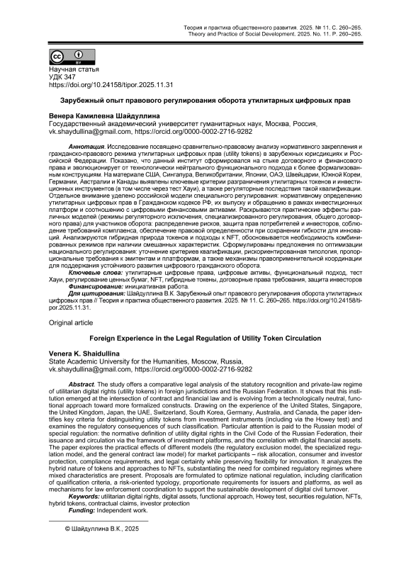 Заключение . Анализ международного опыта регулирования утилитарных цифровых прав позволяет сделать следующие выводы. Утилитарные цифровые права становятся самостоятельным институтом гражданского права, получая специальное регулирование или выделяясь в отдельную категорию в рамках функциональной классификации цифровых активов. Преобладающим подходом к регулированию является функциональный метод, при котором правовой режим определяется экономической сущностью актива, а не его технологической основой или формальным наименованием. Ключевым критерием разграничения утилитарных цифровых прав и инвестиционных инструментов выступает целевое назначение – доступ к товарам, работам или услугам в противовес ожиданию прибыли от усилий других лиц. Российский подход к утилитарным цифровым правам отличается более высокой степенью формализации по сравнению с большинством зарубежных моделей, что обеспечивает большую правовую определенность, но потенциально ограничивает гибкость правоприменения. В мировой практике наблюдается тенденция к признанию гибридной природы многих токенов, что требует комбинированного регулирования, учитывающего как утилитарные, так и возможные инвестиционные характеристики.