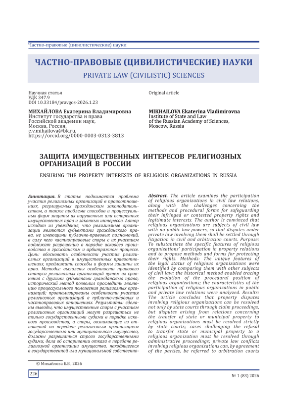 The article examines the participation of religious organizations in civil law relations, along with the challenges concerning the methods and procedural forms for safeguarding their infringed or contested property rights and legitimate interests. The author is convinced that religious organizations are subjects of civil law with no public law powers, so that disputes under private law involving them shall be settled through litigation in civil and arbitration courts. Purpose: To substantiate the specific features of religious organizations’ participation in property relations and to propose methods and forms for protecting their rights. Methods: The unique features of the legal status of religious organizations were identified by comparing them with other subjects of civil law; the historical method enabled tracing the evolution of the procedural position of religious organizations; the characteristics of the participation of religious organizations in public and private law relations were analyzed. Results: The article concludes that property disputes involving religious organizations can be resolved not only by state courts through claim proceedings, but disputes arising from relations concerning the transfer of state or municipal property to religious organizations must be resolved strictly by state courts; cases challenging the refusal to transfer state or municipal property to a religious organization must be resolved through administrative proceedings; private law conflicts involving religious organizations can, by agreement of the parties, be referred to arbitration courts (arbitrations), while religious (spiritual) courts are not arbitration courts.