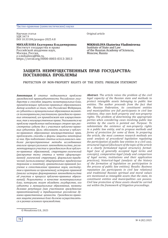 В статье поднимается проблема гражданской правосубъектности Российского государства и способов защиты нематериальных благ, принадлежащих публично-правовым образованиям. Автор исходит из того, что Российская Федерация, ее субъекты и муниципальные образования являются полноправными участниками гражданско-правовых отношений, им принадлежат как имущественные, так и неимущественные права. Указывается на проблему определения надлежащих сторон при рассмотрении судами дел с участием публично-правовых субъектов. Цель: обосновать наличие у публично-правового образования неимущественных прав, предложить способы и формы защиты некоторых из них. При подготовке статьи использовались наиболее распространенные методы исследования: анализа процессуального законодательства, регламентирующего участие в гражданском деле публично-правовых образований, структурно-логический (раскрытие темы статьи в четко сформулированной логической структуре), формально-юридический (использование общепринятых юридических терминов и понятий), сравнительно-правовой (изучение и сопоставление правовых норм, институтов и практики их применения), историко-правовой (анализ истории формирования законодательства об участии в процессе публично-правовых образований). Результаты: в качестве нематериальных благ, которыми могут обладать государство, его субъекты и муниципальные образования, названы деловая репутация (как участников гражданских правоотношений) и традиционные российские духовно-нравственные ценности. Гражданско-правовая защита указанных благ должна осуществляться в рамках искового производства.