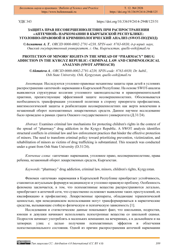 Защита прав несовершеннолетних при распространении «аптечной» наркомании в Кыргызской Республике: уголовно-правовой и криминологический анализ (swot-подход)