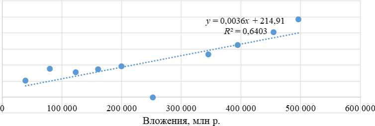 На рис. 4 представлена регрессия, отражающая взаимосвязь вложений в основной капитал в туристской отрасли и дополнительных доходов в туристской отрасли в Сочи в 2015–
