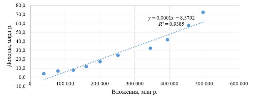 Fig. 4. The relationship (regression) between investments in fixed capital in the tourism industry and additional income in the tourism industry in Sochi in 2015–2024