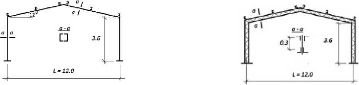 Для определения рационального вида стального каркаса зерносклада устанавливался расход стали по четырем конструктивным схемам каркаса здания шириной 12м (рис. 4), рекомендуемой СП 108.13330.2012 «Предприятия, здания и сооружения по хранению и переработке зерна». Стойки и ригель рамы сплошного сечения (рис.4 а ) предусматривались замкнутого сечения из свариваемых швеллеров, рама сквозного сечения (рис.4 б ) предусмотрена с поясами из уголков и треугольной решёткой. Стойки рамы стоечно-балочной конструкции (рис.4 в ) приняты из круглых труб, ригель – из двутавров типа Б с параллельными гранями полок, Стойки рамы (рис.4 г ) также предусмотрены из круглых труб, ригель – из прямоугольных труб.Кровельные прогоны во всех вариантах выполнялись из прокатных швеллеров по ГОСТ 8240–97. Показатели по каркасам устанавливались применительно к климатическим условиям центральных регионов: III снеговой и I-II ветровые районы. Для оценки влияния параметров каркаса на расход стали шаг рам варьировал от 3,0 до 6,0 м.