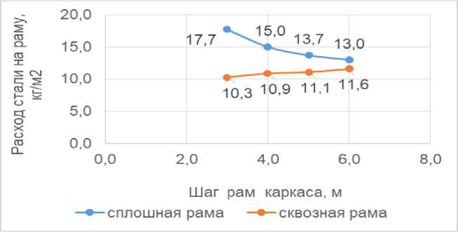 Рисунок 5 – Изменение расхода стали на раму каркаса сплошного сечения из швеллеров и сквозную раму в зависимости от шага рам