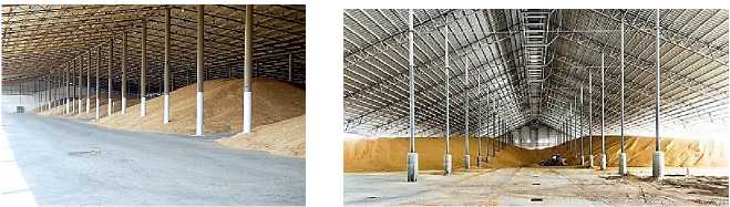 Рисунок 1 – Внутренний вид зерноскладов из лёгких стальных конструкций: а – с рамным каркасом; б, в – со стоечно-балочным каркасом