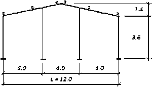 где L – ширина здания; h – высота помещения равная 3,6 м; α – угол наклона ската кровли (при использовании стального профилированного настила минимально равный 12о).