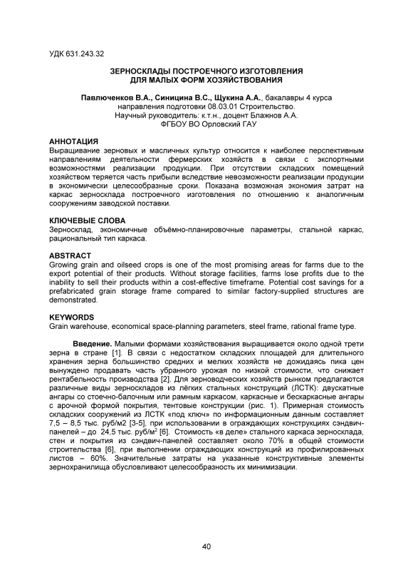 Growing grain and oilseed crops is one of the most promising areas for farms due to the export potential of their products. Without storage facilities, farms lose profits due to the inability to sell their products within a cost-effective timeframe. Potential cost savings for a prefabricated grain storage frame compared to similar factory-supplied structures are demonstrated.