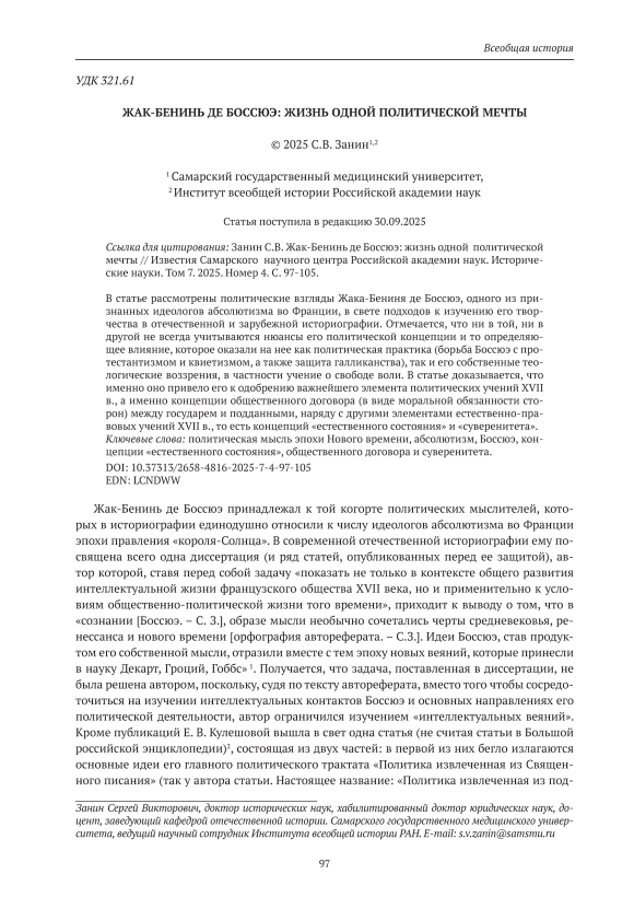 В статье рассмотрены политические взгляды Жака-Бениня де Боссюэ, одного из признанных идеологов абсолютизма во Франции, в свете подходов к изучению его творчества в отечественной и зарубежной историографии. Отмечается, что ни в той, ни в другой не всегда учитываются нюансы его политической концепции и то определяющее влияние, которое оказали на нее как политическая практика (борьба Боссюэ с протестантизмом и квиетизмом, а также защита галликанства), так и его собственные теологические воззрения, в частности учение о свободе воли. В статье доказывается, что именно оно привело его к одобрению важнейшего элемента политических учений XVII в., а именно концепции общественного договора (в виде моральной обязанности сторон) между государем и подданными, наряду с другими элементами естественно-правовых учений XVII в., то есть концепций «естественного состояния» и «суверенитета».