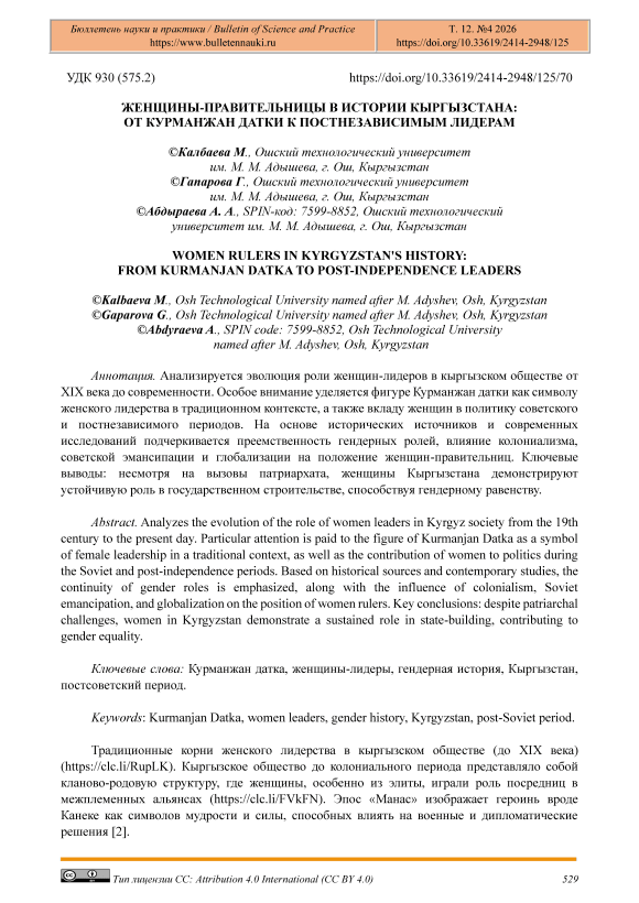 Анализируется эволюция роли женщин-лидеров в кыргызском обществе от XIX века до современности. Особое внимание уделяется фигуре Курманжан датки как символу женского лидерства в традиционном контексте, а также вкладу женщин в политику советского и постнезависимого периодов. На основе исторических источников и современных исследований подчеркивается преемственность гендерных ролей, влияние колониализма, советской эмансипации и глобализации на положение женщин-правительниц. Ключевые выводы: несмотря на вызовы патриархата, женщины Кыргызстана демонстрируют устойчивую роль в государственном строительстве, способствуя гендерному равенству.