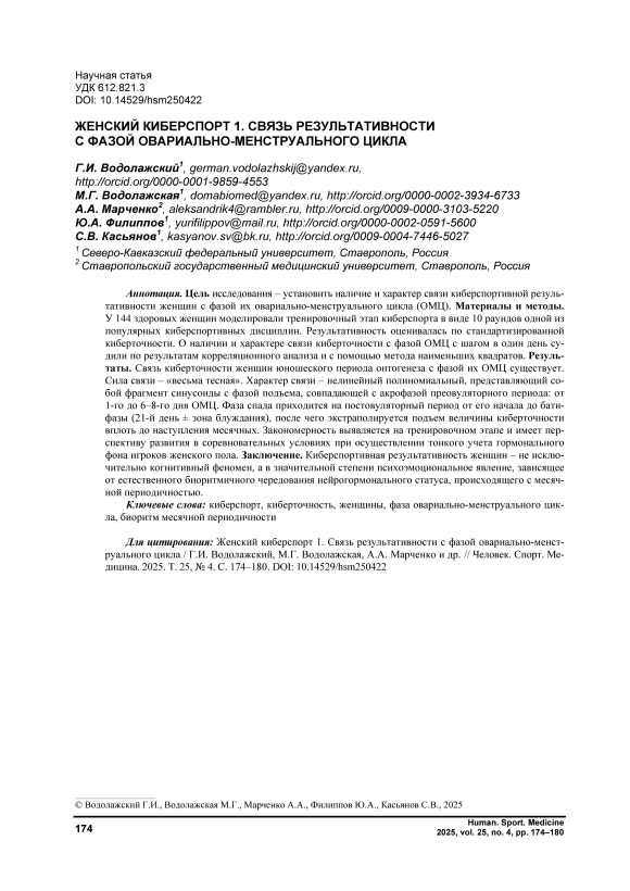 Цель исследования – установить наличие и характер связи киберспортивной результативности женщин с фазой их овариально-менструального цикла (ОМЦ). Материалы и методы. У 144 здоровых женщин моделировали тренировочный этап киберспорта в виде 10 раундов одной из популярных киберспортивных дисциплин. Результативность оценивалась по стандартизированной киберточности. О наличии и характере связи киберточности с фазой ОМЦ с шагом в один день судили по результатам корреляционного анализа и с помощью метода наименьших квадратов. Результаты. Связь киберточности женщин юношеского периода онтогенеза с фазой их ОМЦ существует. Сила связи – «весьма тесная». Характер связи – нелинейный полиномиальный, представляющий собой фрагмент синусоиды с фазой подъема, совпадающей с акрофазой преовуляторного периода: от 1-го до 6–8-го дня ОМЦ. Фаза спада приходится на постовуляторный период от его начала до батифазы (21-й день ± зона блуждания), после чего экстраполируется подъем величины киберточности вплоть до наступления месячных. Закономерность выявляется на тренировочном этапе и имеет перспективу развития в соревновательных условиях при осуществлении тонкого учета гормонального фона игроков женского пола. Заключение. Киберспортивная результативность женщин – не исключительно когнитивный феномен, а в значительной степени психоэмоциональное явление, зависящее от естественного биоритмичного чередования нейрогормонального статуса, происходящего с месячной периодичностью.