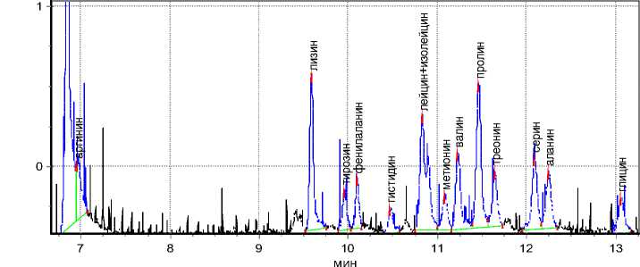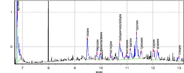 Ақуыздың аминқышқылдық құрамы М-0438-2009 (МЕМСТ Р 55569-2013) әдістемесі бойынша, аминқышқылдарын талдауға арналған арнайы кассетасы бар «КАПЕЛЬ-105М» капиллярлық электрофорез жүйесінің көмегімен анықталды [8].