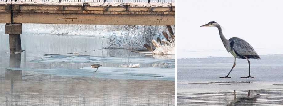 С начала января 2026 года установилась длительная холодная погода с ночными температурами воздуха ниже -20°C. 7 января 2026 на озере, практически полностью скованном льдом, были обнаружены две серых цапли. Первая замечена в 14 ч 19 мин на участке между дамбой и автомобильным мостом (рис. 4), где она, стоя на льду, высматривала рыбу до 15 ч 43 мин, когда перелетела за тростники к западному берегу и вернулась обратно в 16 ч 23 мин. Вторая цапля замечена в 14 ч 41 мин у края полосы тростников у участка с открытой водой, где до 15 ч 20 мин наблюдалась стоящей неподвижно. 29 января 2026 серая цапля замечена с западного берега в 15 ч 15 мин при полёте к небольшому свободному ото льда участку у западного берега – месту выхода ключа.