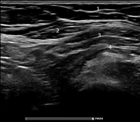 Рисунок 1. Пациент Н, 54 года. Изображение левосторонней косой паховой грыжи при ультрасонографическом исследовании: 1 – подкожно-жировая клетчатка; 2 – наружная косая мышца живота; 3 – грыжевой мешок; 4 – поперечная мышца живота и апоневроз, прилегающие к глубокому паховому кольцу