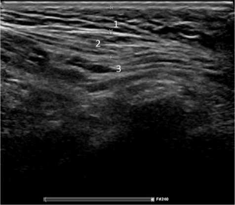 Рисунок 2. Пациент Н, 54 года. Изображение прямой правосторонней паховой грыжи при ультрасонографическом исследовании: 1 — подкожно-жировая клетчатка; 2 — наружная косая мышца живота; 3 — грыжевой мешок
