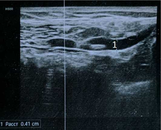 Рисунок 3. Пациентка Н., 45 лет. Изображение правосторонней косой паховой грыжи при ультрасонографическом исследовании: 1 – грыжевой мешок, расположенный в круглой связке матки Figure 3. Patient N., 45 years old. Ultrasonographic image of a rightsided oblique inguinal hernia: 1 – hernial sac located in the round ligament of the uterus