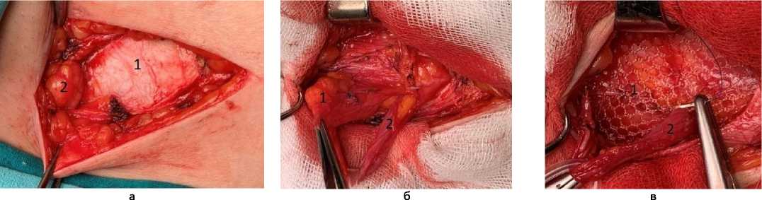 Figure 4. Patient K., born in 1983. Diagnosis: left-sided direct inguinal hernia. Stages of the operation: a – view of the anterior wall of the inguinal canal (1) and the hernial sac (2) protruding from the external opening of the inguinal canal; б – the anterior wall of the inguinal canal is opened, view of the round ligament of the uterus (2) and the hernial sac (1) of a direct inguinal hernia; в – view of the mesh implant (1) with the installation of the round ligament of the uterus (2) in the Cooks window; г – view of the sutured anterior wall of the inguinal canal (1) and the round ligament of the uterus (2) located in the subcutaneous tissue, Cooks window (3); д – completed view of the operation