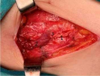 Рисунок 4. Пациентка К., 1983 года рождения. Диагноз: левосторонняя прямая паховая грыжа. Этапы операции: а – вид передней стенки пахового канала (1) и грыжевого мешка (2), выступающего из наружного отверстия пахового канала; б – вскрыта передняя стенка пахового канала, вид круглой связки матки (2) и грыжевого мешка (1) прямой паховой грыжи; в – вид сетчатого имплантата (1) с установкой в окне Кукса круглой связки матки (2); г – вид ушитой передней стенки пахового канала (1) и круглой связки матки (2), расположенной в подкожной клетчатке, окно Кукса (3); д – завершенный вид операции