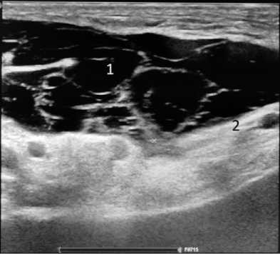 Figure 6. Patient A., 65 years old. Diagnosis: left-sided oblique inguinal hernia. Ultrasound of the inguinal region after herniotomy using the Lichtenstein method, complicated by postoperative hematoma: 1 – hematoma; 2 – mesh implant