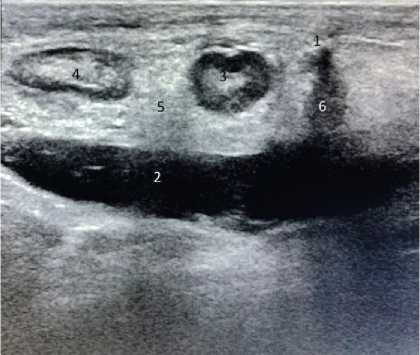 Figure 7. Patient H., 44 years old. Diagnosis: right-sided inguinal hernia. Ultrasound of the inguinal region after herniotomy using the Lichtenstein technique, complicated by postoperative infiltrate: 1 – mesh implant; 2 – seroma with signs of infection; 3, 4 – enlarged lymph nodes; 5 – infiltrate under the aponeurosis; 6 – fistula tract