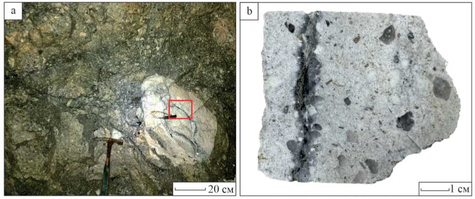 Рис. 2. Минерализованная брекчия месторождения Тунанца: a — полукруглый обломок риолитового кварц-полевошпатового порфира; красная рамка показывает место отбора образца для фотографии b; b — прожилок сульфидов и кварца, пересекающий обломок риолитового кварц-полевошпатового порфира с кварц-серицитовым метасоматозом; крупные кри-