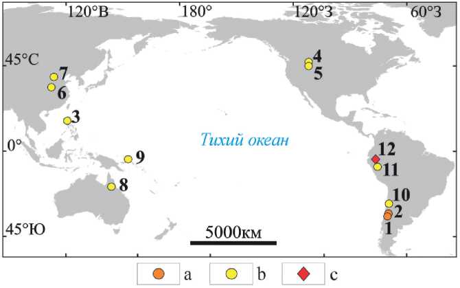 Рис. 3. Расположение месторождения Тунанца и подобных объектов, связанных с брекчиевыми трубками. Составлено на основе анализа литературы, приведенной в данной статье: a — медно-молибденовый порфировый тип: 1 — Эль-Теньенте, Чили; 2 — Рио-Бланко-Лос-Бронсес, Чили; b, c — эпитермальные: 3 — Акупан, Филиппины; 4 — Монтана Таннелс, США; 5 — Голден Санлайт, США; 6 — Дяньфан, Китай; 7 — Исинчжай, Китай; 8 — Кидстон, Австралия; 9 — Ладолам, Папуа – Новая Гвинея; 10 — Паскуа, Чили – Аргентина; 11 — Янакоча, Перу; 12 — Тунанца, Эквадор