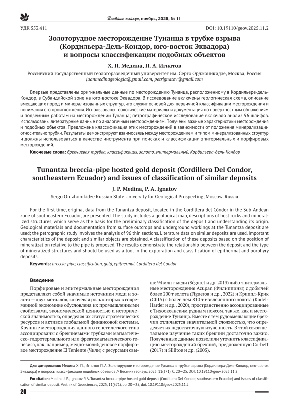Впервые представлены оригинальные данные по месторождению Тунанца, расположенному в Кордильере-дель-Кондор, в Субандийской зоне на юго-востоке Эквадора. В исследование включены геологическая схема, описание вмещающих пород и минерализованных структур, что служит основой для первичной классификации месторождения и понимания его происхождения. Использованы геологические материалы и документация по поверхностным обнажениям и подземным работам на месторождении Тунанца; петрографическое исследование включало анализ 96 шлифов. Использованы литературные данные по аналогичным месторождениям. Получены важные характеристики месторождения и подобных объектов. Предложена классификация этих месторождений в зависимости от положения минерализации относительно трубки. Результаты демонстрируют взаимосвязь между месторождением и типом минерализованных структур и должны использоваться в качестве инструмента при поисках и классификации эпитермальных и порфировых месторождений.